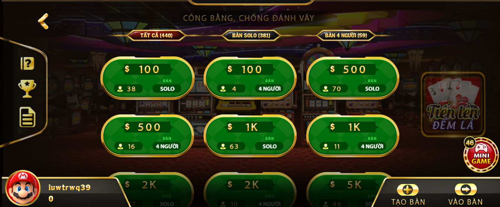 Bước 2: Click vào mục “Game Bài” và chọn vào biểu tượng của Sâm Lốc, sau đó chọn bàn chơi có mức cược phù hợp