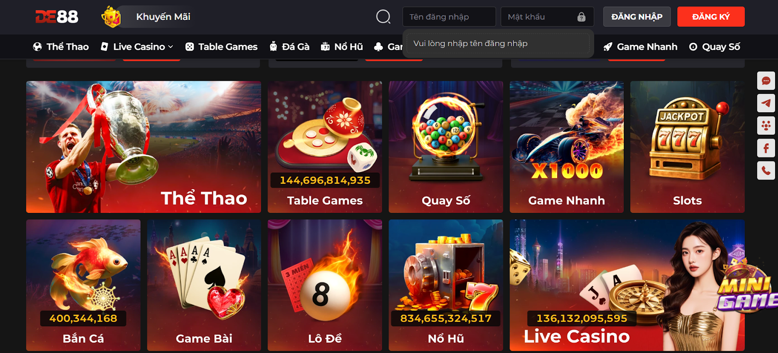 - “Ứng dụng có đầy đủ sảnh cá cược chứ? _ Bạn hãy yên tâm, app của nhà cái DE88 có đủ các chuyên mục cá cược hàng đầu như: Thể Thao, Casino, Game Bài, Slots, Bắn Cá, Lô Đề, Đá Gà để khách hàng cá cược.