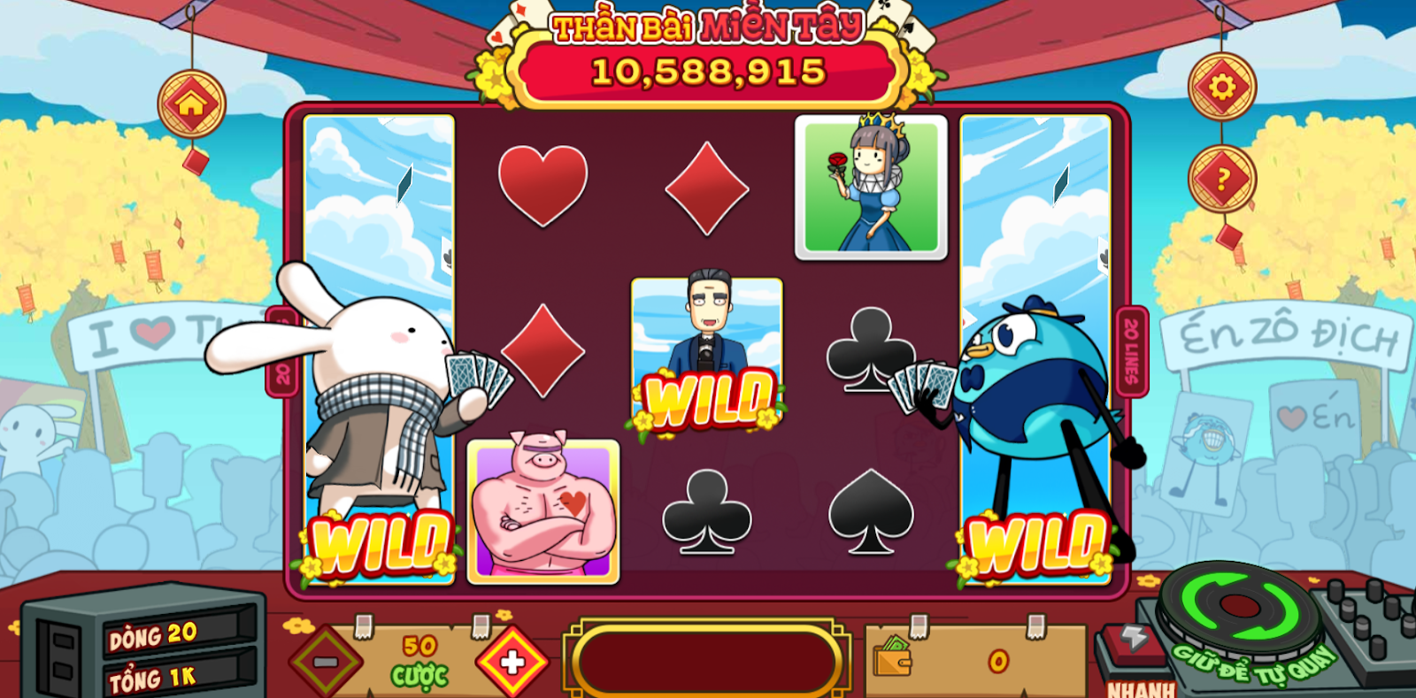 Khi vào game, bên dưới màn hình sẽ có ô “Tổng cược”, bạn hãy nhấn chọn vào dấu “+” hoặc “-” để tăng giảm tiền cược từ 1000, 10000, 50000, 100000, 1000000 hoặc 5000000. Mức tiền cược càng cao thì tiền thưởng càng lớn, thưởng Jackpot càng khủng.